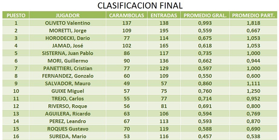 Celebrando los 100 años del Centro Español, la institución que dirige Edgardo Vilar, ha decidido realizar diferentes eventos relacionados con el quehacer deportivo y cultural, en este caso y reeditando aquellos espectaculares Torneos Regionales de Billar que tantas satisfacciones ha dado, se llevó a cabo el Torneo de Billar a Tres Bandas “Centenario Centro Español”. Se vivieron momentos de mucha emoción y recuerdos, con la presencia de los más prestigiosos jugadores del país y también internacional. La final la disputaron Valentino Oliveto y Jorge Moretti, el chico de 21 años (campeón panamericano y número uno en la Argentina), se quedó con la competencia. Cabe destacar que el rojense Gustavo Roqués fue el que más lejos llegó, cayendo en un gran partido en cuartos de final