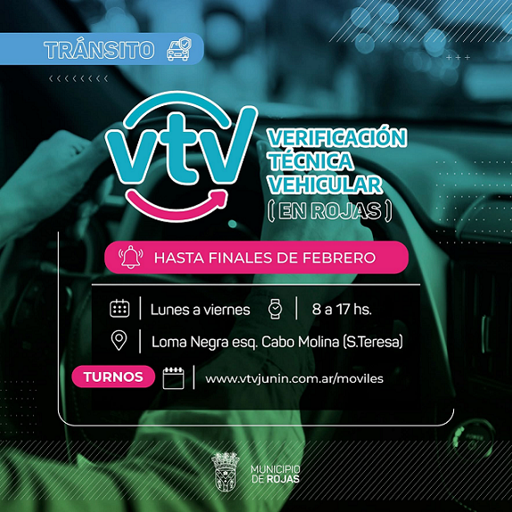 La Verificación Técnica Vehicular atiende en Rojas Publicado: 15 Enero 2026 La Verificación Técnica Vehicular atenderá en Rojas hasta finales de febrero en calle Loma Negra y Cabo Molina en Barrio Santa Teresa en el horario de 8 a 17 horas de lunes a viernes. Solicitá turnos https://www.vtvjunin.com.ar/moviles Categoría: Locales