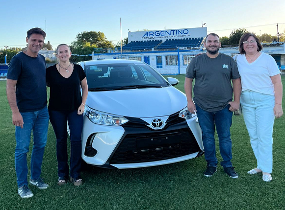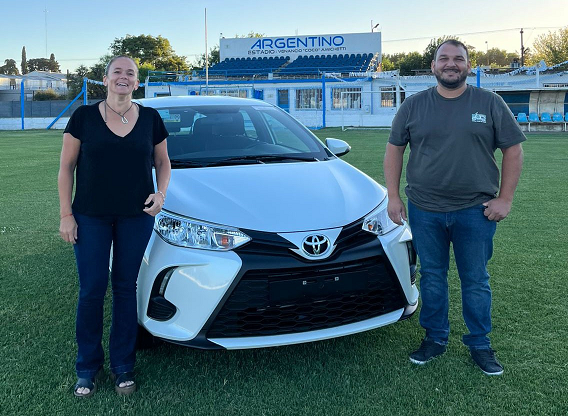 El presidente de Argentino, Andrés Álvarez junto a la vice Sandra Aranda, entregan el automóvil Yaris 0km. a Victoria Fauda y Martín Amichetti
