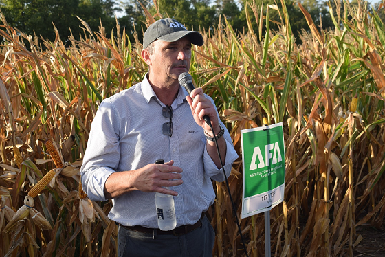 El Ing. Agr. Diego Buschittari, mostrando los nuevos maíces híbridos en el AFA a Campo 2026