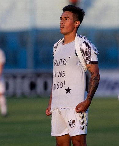 Matías Tissera, con la camiseta de latense y la dedicatoria para su amigo Poroto Verón