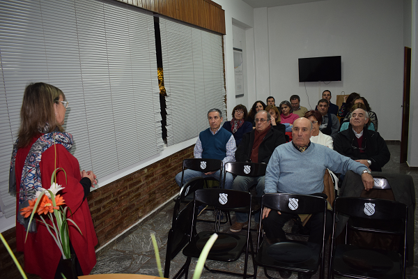 Olga González dando la bienvenida a los asistentes a la charla en el Banco Credicoop