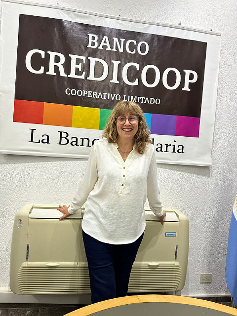 Adriana Gizzi, semi oculta al centro de la foto, junto a las autoridades y compañeros de trabajo de Banco Credicoop, Filial Rojas